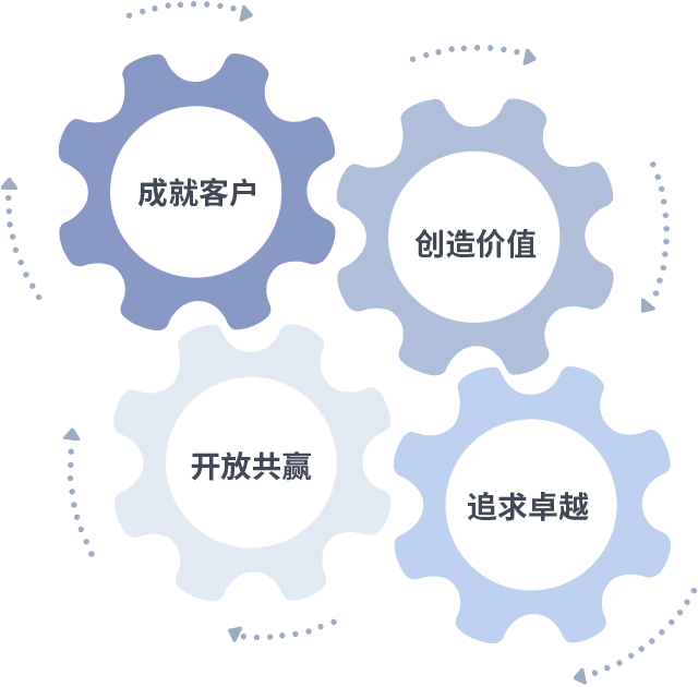 成就客户是一切决策的出发点,,,,创造价值是衡量所有工作的标准,,,,追求卓越是我们做事做人的态度,,开放共赢是我们的格局也是最终的结果。。。。价值观的齿轮环环相扣,,,,推动着组织里的每个人不断向前。。